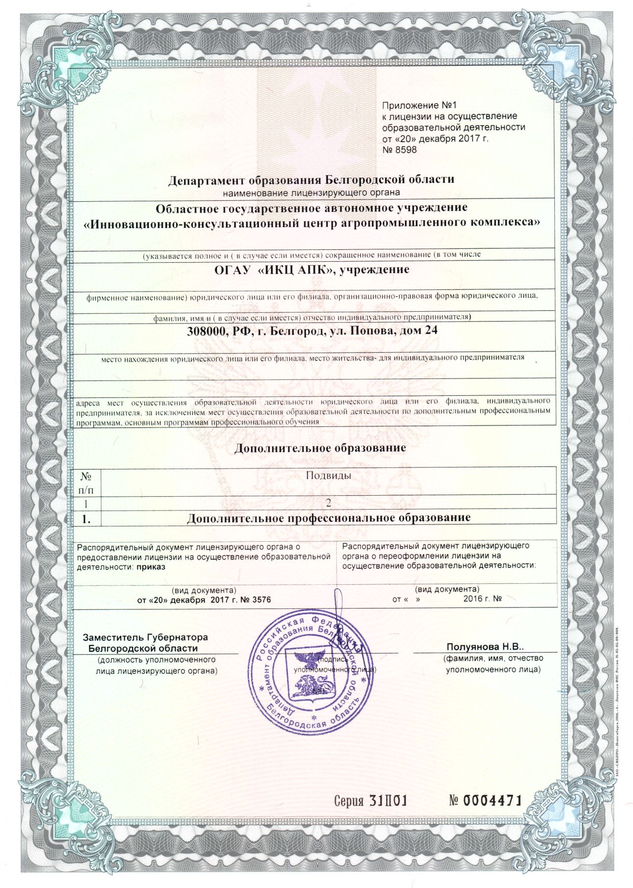 ОГАУ «ИКЦ АПК» не предоставляет платные образовательные услуги, обучение по дополнительным профессиональным программам повышения квалификации осуществляется в рамках ежегодного Государственного задания по реализации дополнительных профессиональных программ повышения квалификации и в соответствии с Планом мероприятий по образовательной деятельности ОГАУ «ИКЦ АПК».